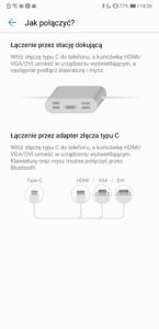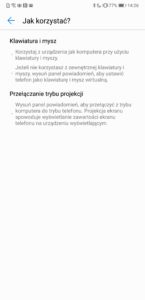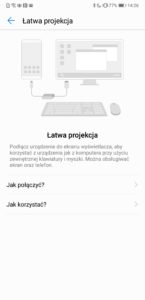 - łatwa projekcja – za pomocą tej funkcji możemy podłączyć telefon do telewizora/monitora i korzystać z smartfonu jak komputera a to dzięki zastosowaniu EMUI Desktop. Interfejs ten nie jest lustrzanym odbiciem tego co mamy na smartfonie, lecz odrębnym „systemem” który ma ułatwić nam pracę. Praca z trybem projekcji będzie jeszcze łatwiejsza gdy podłączymy do telefonu klawiaturę i mysz. Jednak w przypadku nie podłączenia zewnętrznej klawiatury i myszy, za te urządzenia peryferyjne będzie mógł nam służyć smartfon;