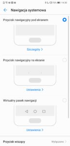 - nawigacja systemowa – tak jak wspominałem przy skanerze linii papilarnych, czytnik może nam służyć jako przyciski nawigacyjne i wtedy jest to przycisk nawigacyjny pod ekranem. Dostępne są jeszcze dwa warianty nawigowania po systemie, standardowe przyciski nawigacyjne na ekranie lub pasek nawigacyjny na ekranie. Pasek ten funkcjonuje dokładnie tak samo jak skaner linii papilarnych gdy mamy ustawiony jako przyciski nawigacyjne. Czyli wróć – dotknięcie paska/skanera linii papilarnych, ekran główny – przytrzymanie paska/skanera, ostatnie zadania – przesunięcie w prawo lub lewo po pasku/skanerze oraz aplikacja Google po przesunięciu palcem do góry po pasku/skanerze;