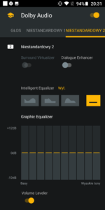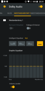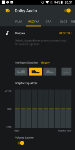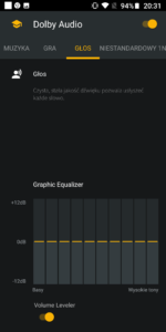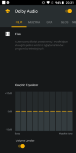 Głośnik w Motoroli Moto G6 gra zaskakująco dobrze, a dodatkową jego zaletą jest technologia Dolby Audio. Technologia ta pozwala podkręcić wychodzący z głośnika dźwięk o dodatkowe basy i tony. W aplikacji którą znajdziemy w smartfonie mamy dostępne klika dedykowanych schematów dźwięku (Gra, Muzyka, Film, Głos), ale również możemy je sami dostosować za pomocą rozbudowanego equalizera. Dźwięk z włączonym Dolby Audio jest o wiele większej jakości i głębi w porównaniu do tego dźwięku bez włączonej tej technologii.